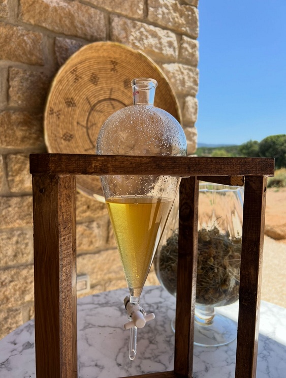 L’huile essentielle d’immortelle est obtenue par distillation à la vapeur d’eau, une méthode naturelle qui permet d’isoler les composés aromatiques de la plante fraîche, sans recours à des solvants chimiques. Nous réalisons la distillation directement sur nos champs, à l’aide d’un alambic artisanal. Chaque séance dure environ trois heures, et malgré ce long processus, l’hélichryse reste généreusement rare : il faut un grand volume de plantes pour obtenir seulement une infime quantité d’huile précieuse.