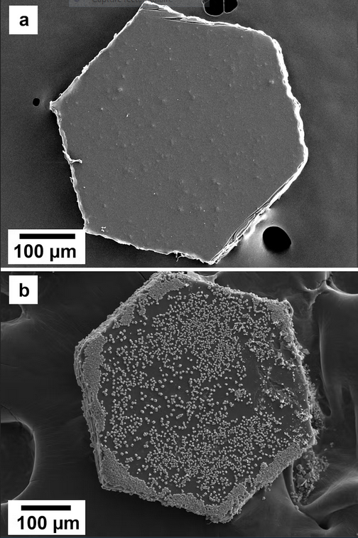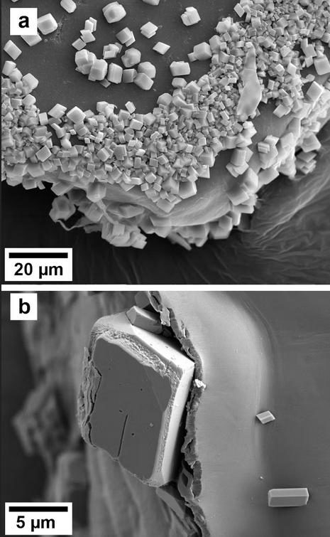Au microscope, nous avons constaté que les particules de paillettes agissaient comme de petites plates-formes pour la croissance des cristaux. Des minéraux se formaient sur toute leur surface, en particulier autour des fissures et des arêtes. Il ne s’agissait pas d’une accumulation lente : quelques minutes suffisaient pour que des cristaux apparaissent.