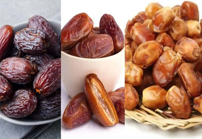 Quelques-unes des différentes variétés de dattes : à gauche, la medjool (ou jumbo) ; au centre, la datte Deglet Noor semi-sèche ; et à droite, la datte Zahidi sèche. Ce sont d’excellentes options pour remplacer la consommation de sucre et apaiser les envies de sucré. Mais attention : n’en abusez pas ! Crédit : Divulgation.