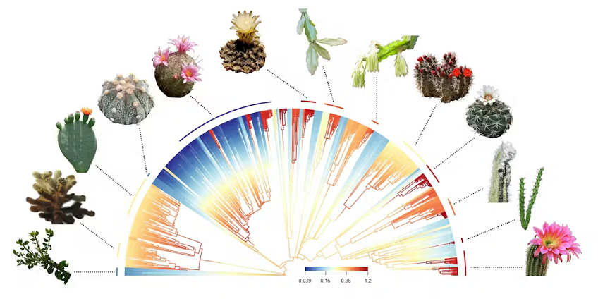 L’arbre généalogique des cactus. Les espèces sont classées en fonction de la vitesse de formation de nouvelles espèces (phénomène de spéciation). Jamie Thompson et coll., Nature Communications (2024)