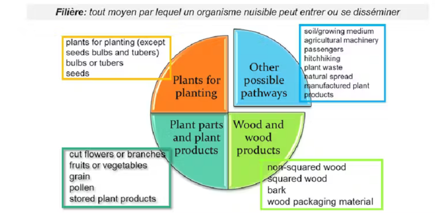 Les voies d’introduction les plus classiques impliquent par exemple le transport de végétaux, de semis, de fleurs coupées, ainsi que le résume l’illustration ci-dessous. Cependant, d’autres filières d’entrée moins conventionnelles existent également.