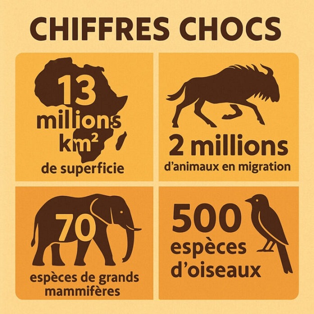 Kenya, Tanzanie, Ouganda abritent les savanes les plus célèbres : Serengeti, Masai Mara, Tsavo. Ces régions concentrent la plus forte densité de grands mammifères au monde.